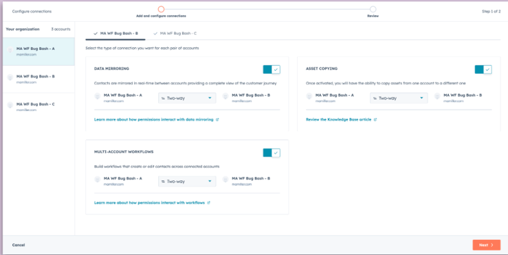 Voit hallita ja ajaa workflow’ita useassa HubSpot-portaalissa yhdestä yhtenäisestä näkymästä – samat automaatiot, säännöt ja logiikka voidaan orkestroida keskitetysti ilman, että sinun tarvitsee hypellä portaaleiden välillä tai rakentaa prosesseja moneen kertaan. Tämä helpottaa erityisesti tilanteissa, joissa eri portaalit palvelevat eri maita, brändejä tai liiketoimintayksiköitä, mutta haluat pitää perusprosessit, datarakenteet ja automaatiot linjassa.