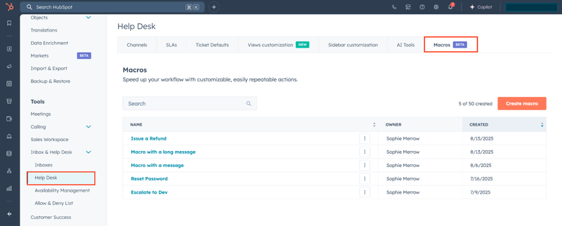 Voit luoda valmiita makroja usein toistuviin tukitilanteisiin: yhdessä paketissa määrittelet valmiit vastaukset asiakkaalle, tarvittavat sisäiset toimenpiteet (esim. tiketin siirto tiimiltä toiselle, tehtävien luonti, kommentit agenteille) sekä automaattisesti päivittyvät propertyt. Käyttäjä valitsee vain oikean makron, ja HubSpot hoitaa sekä viestinnän että taustalla tapahtuvat päivitykset samalla kertaa.